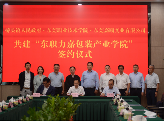 为推动“政校企”深度融合,促进我市包装相关产业高质量发展,4月29日上午,东莞市桥头镇人民政府、东莞职业技术学院、东莞力嘉国际集团三方,共同签约共建“东职力嘉包装产业学院”。桥头镇委副书记、镇长刘锦棠,副镇长陈锐毅、莫镇鹏,东莞职业技术学院党委书记朱益民,党委副书记、校长贺定修,党委委员、副校长杨云奇,力嘉国际集团董事长马伟武,以及桥头镇相关部门、东莞职业技术学院相关院系负责人等参加了签约仪式。