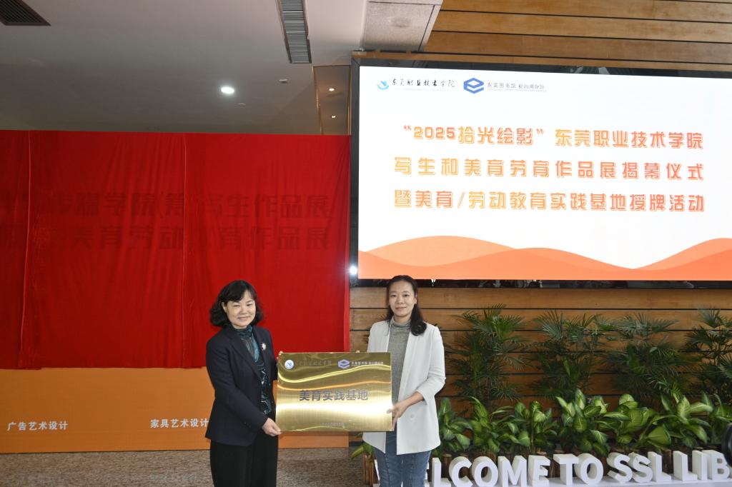 致辞结束后,我校创意设计与传媒学院(筹)党组织负责人车美娟、通识学院(筹)行政负责人肖庆丰代表学校分别参与了“美育实践基地”与“劳动教育实践基地”授牌仪式。此次实践基地的正式挂牌,标志着我校与松山湖图书馆的合作迈入新阶段。