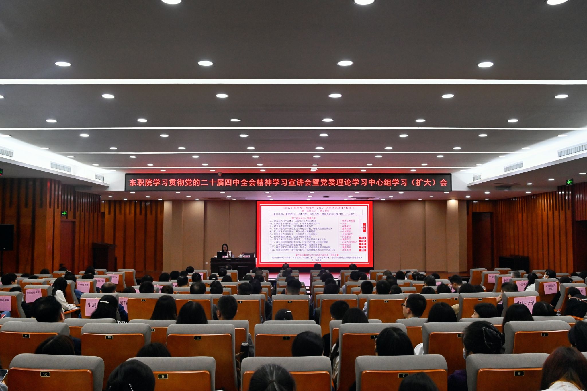 会议由党委书记司琪主持。会上,周虹教授紧扣党的二十届四中全会精神,结合了职业教育的特点和东莞、学校的发展实际,从准确把握“十五五”时期我国发展所处的历史方位、深刻领会“十五五”时期经济社会发展的总体要求、扎实推进“十五五”时期经济社会发展的战略任务以及坚决贯彻为实现“十五五”规划而奋斗的主要部署四个方面进行一场重点突出、阐释深刻的辅导报告。